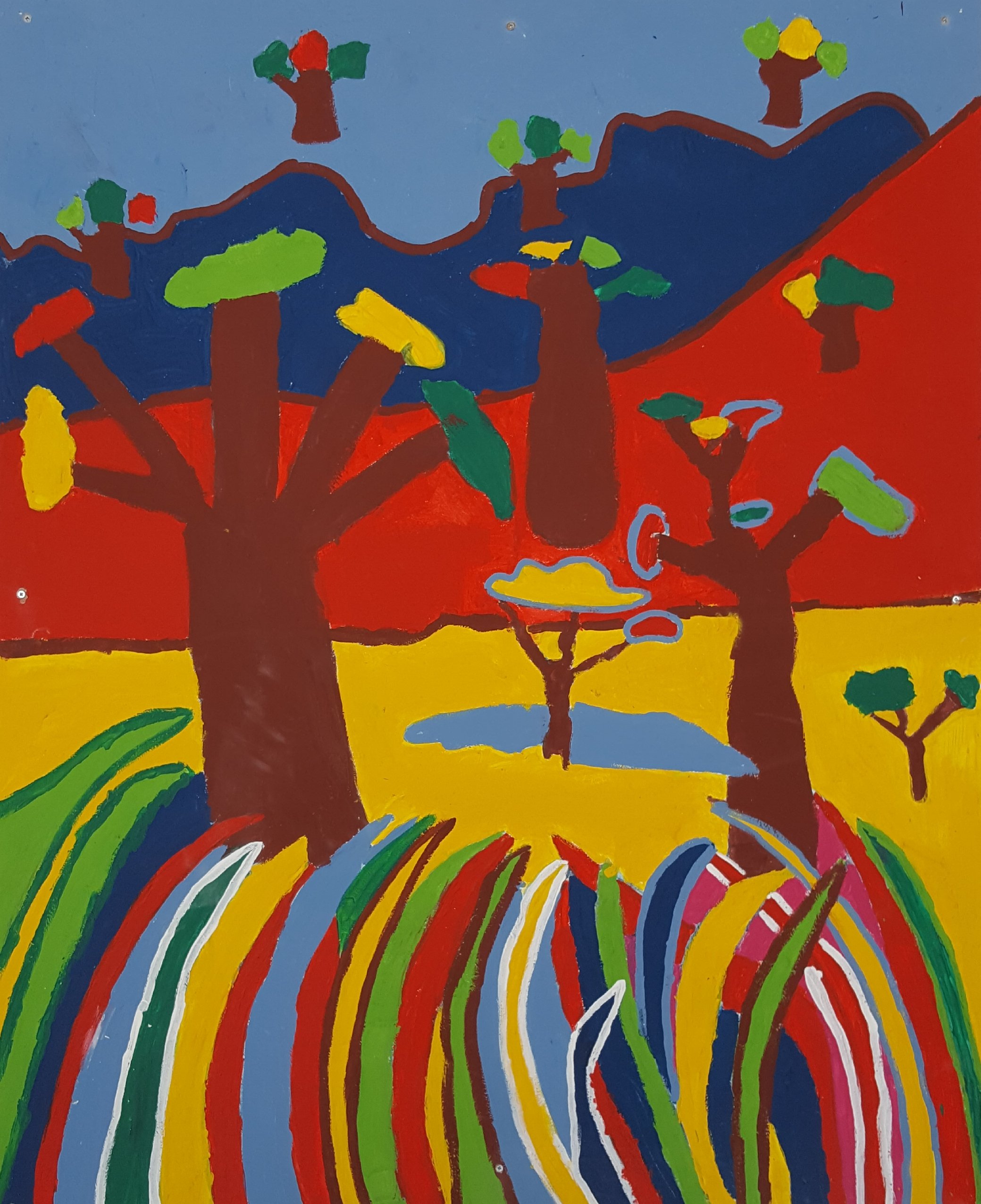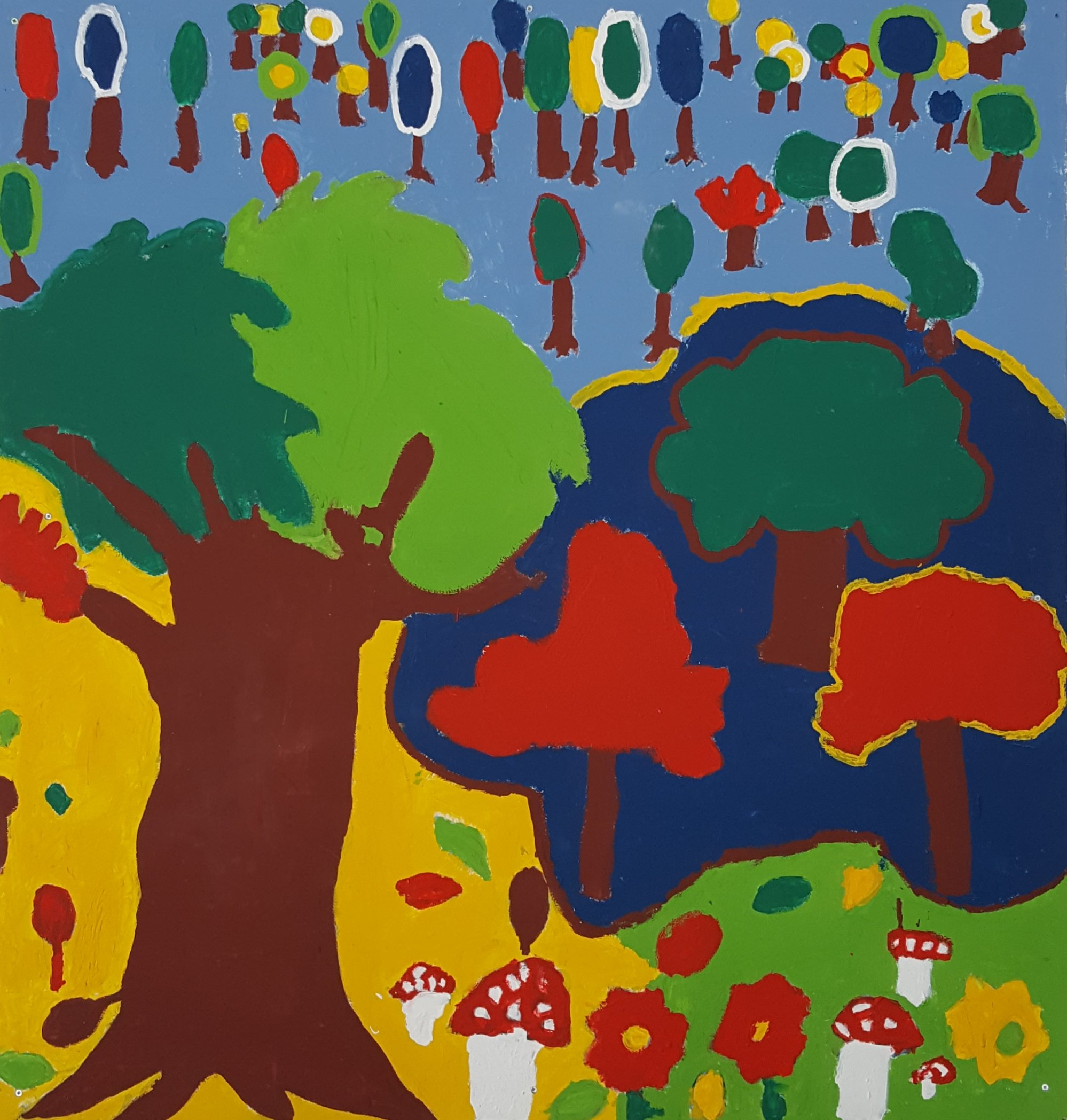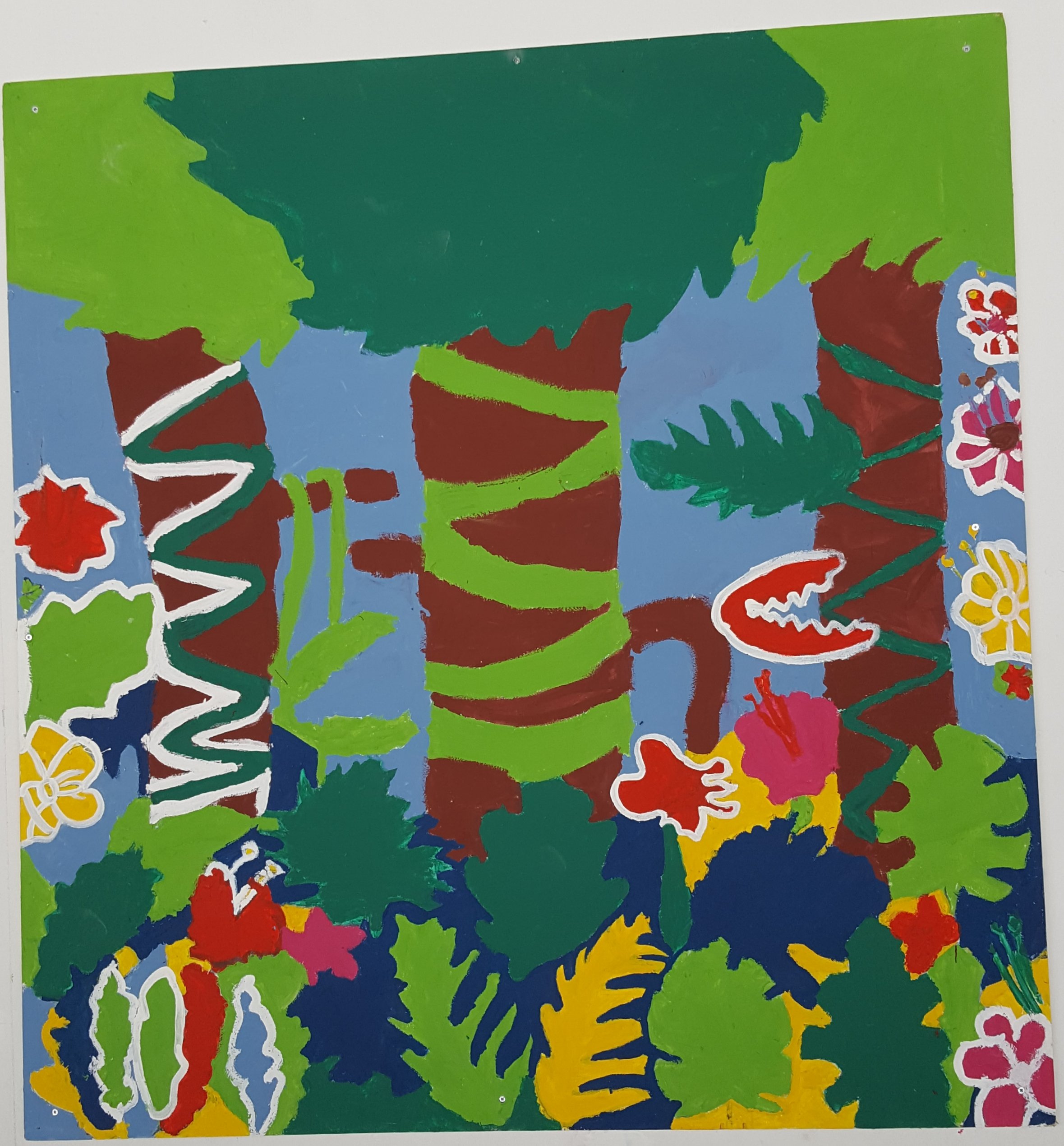 Une fois n’est pas coûtume voici des acryliques sur papier que j’ai réalisée pour imaginer ce que je pourrais faire peindre aux enfants. 5 panneaux de 150/150 et 3 de 150/120. Le thème souhaité par les enseignants est la nature. Manque ici le sous-sol : je couperais bien une des planches en 3 dans le sens de la longeur pour le poser dessous comme une prédelle sur un polyptique. Il y aurait aussi des animaux disposés en frise qui feraient le tour du préau où seront fixés les panneaux et d’autres animaux empilés sur des poteaux. Bref un gros projet qui m’a déjà pris beaucoup de temps et que j’ai envie de partager. Vous en verrez le résultat final d’ici quelques mois. 😉
