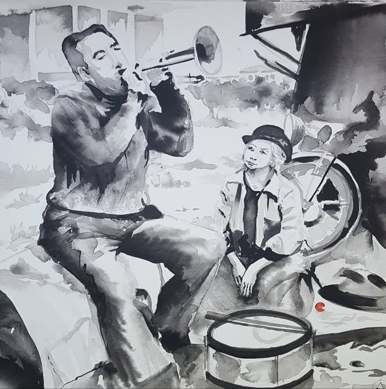 L’idée de cette toile est née de réflexions suite au massacre d’Orlando. Si l’homosexualité décenche une telle violence c’est peut-être qu’on la cache trop. Toute hétéro que je suis ne puis-je pas faire du beau avec une représentation moins normée de l’amour et de la tendresse ? Je vais maintenant réaliser une seconde toile de la même taille avec deux femmes. ☺