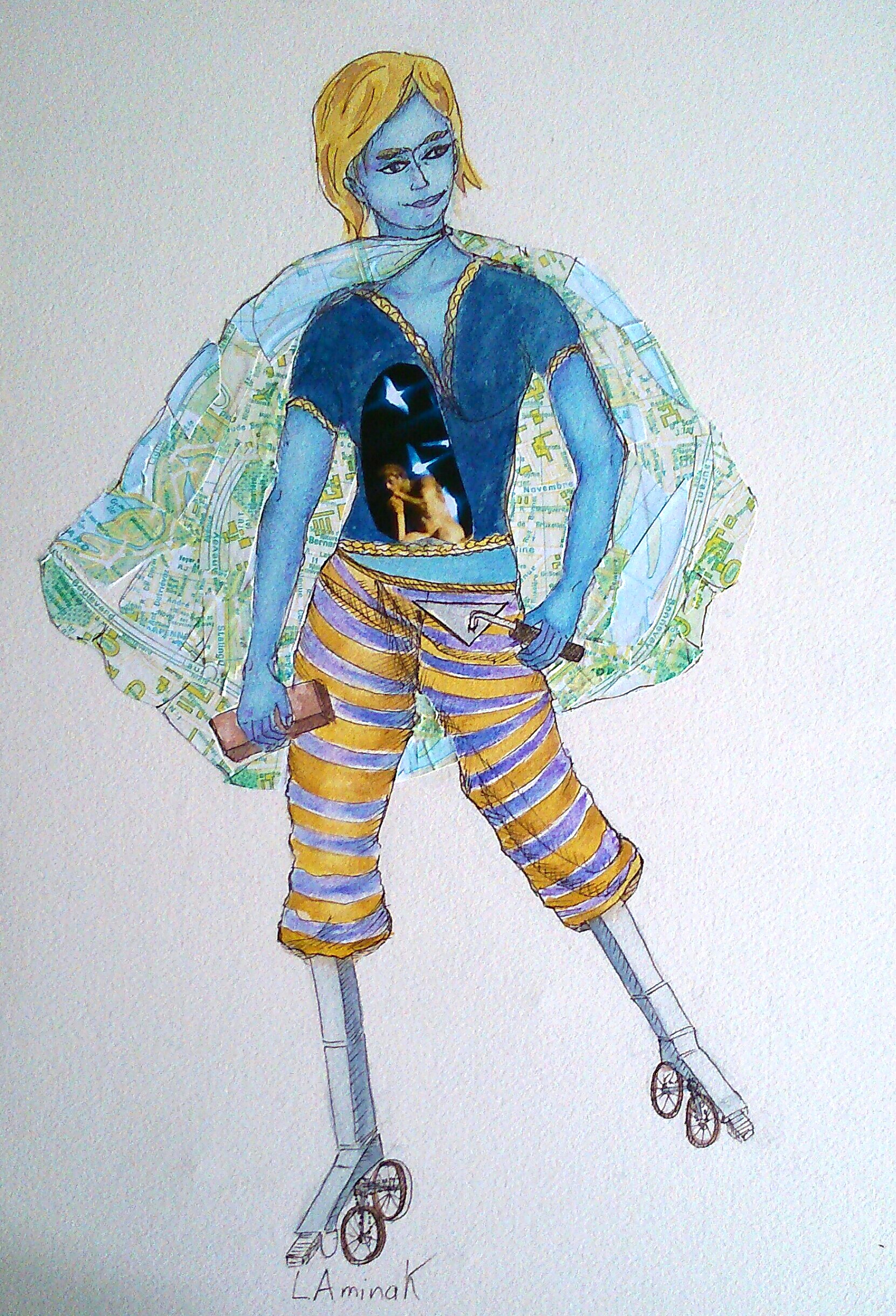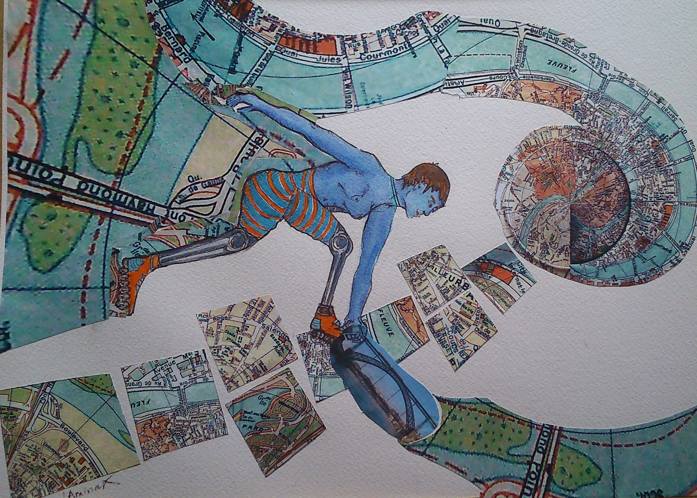 « je cours à la nage » Bambi Galaxy, aquarelle encre collages,40/30cm